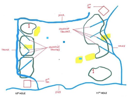 11th Hole: Starting to the left of the men’s tee box, the trench will run up and over the brow of the hole, then behind the mound and into the ditch alongside the car park.